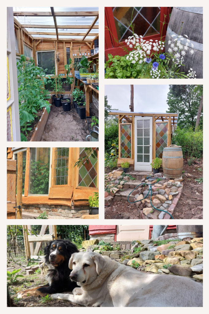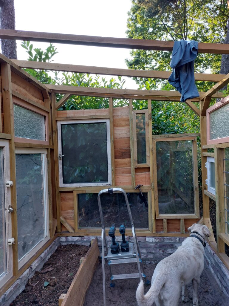 Toen konden we het houten frame bouwen. Voor het glas hebben we allemaal ramen gebruikt welke we overal gratis hebben opgehaald. Ik vind het echt prachtig al die verschillende ramen en kozijnen die allemaal een eigen verhaal hebben. Het mooiste zijn de meerdere glas in lood ramen, waarvan we er twee hebben opgehaald bij een kast van een huis in de buurt. En de twee gekleurde ramen aan de voorkant, stonden bij mijn ouders in de schuur toen ze hun huis 33 jaar geleden kochten. Dus erg gaaf dat deze na al die tijd weer een functie hebben.