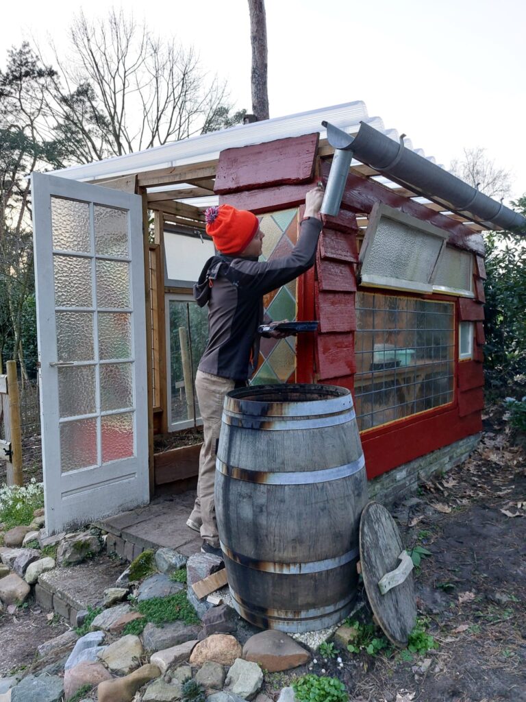 Een ding is in ieder geval zeker, ik ben ontzettend blij met het resultaat! Daarbij heeft Ewoud nog een prachtige zinken regengoot gehaald. En van mijn ouders heb ik een wijnvat voor water opvang gekregen. Het was wel duidelijk dat dit vat daadwerkelijk voor wijn gebruikt is want de auto van mijn ouders heeft nog weken naar een wijnkelder geroken. Uiteindelijk hebben we besloten het hout in mooi Noors rood te beitsen.